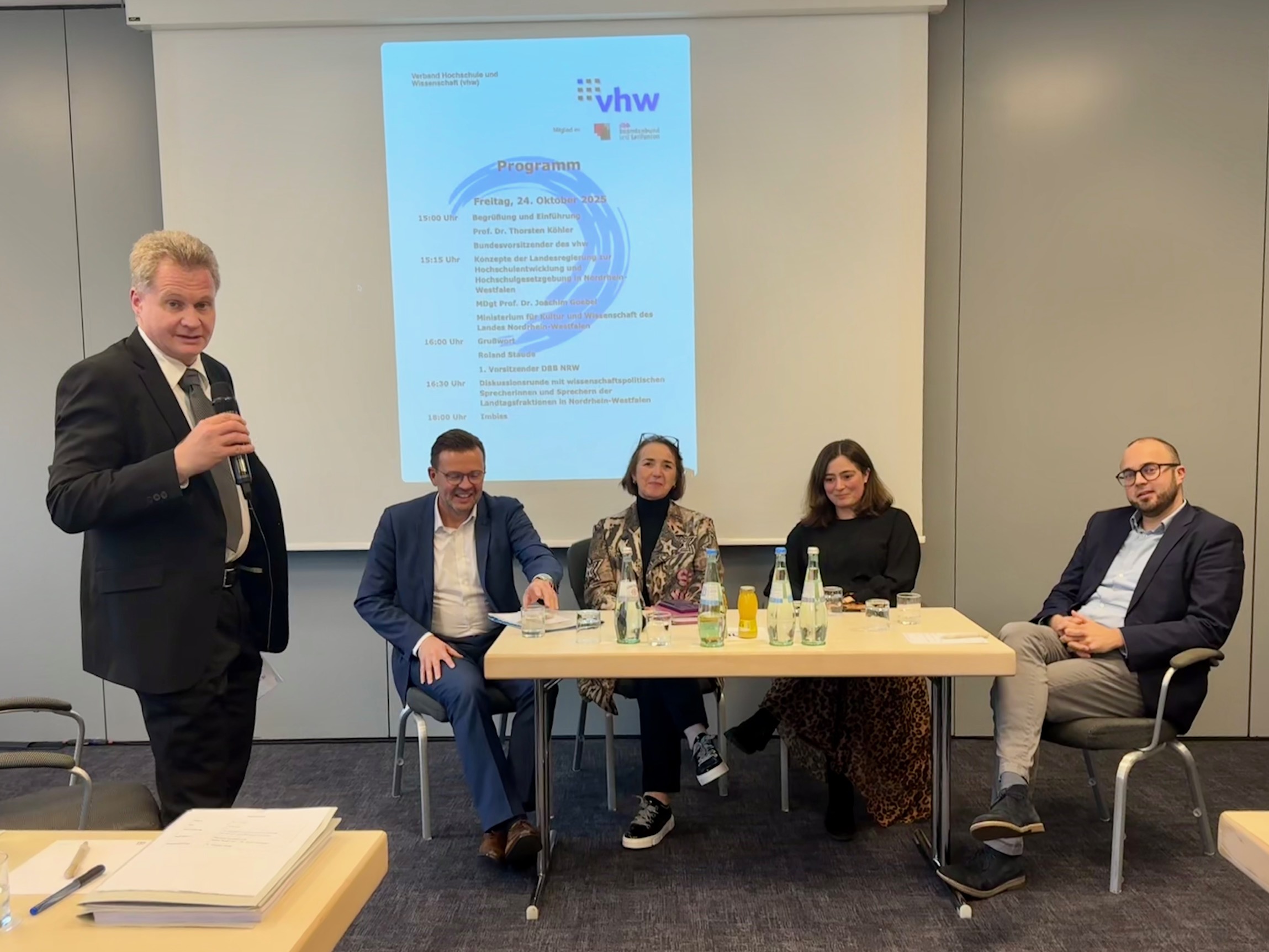 Im Anschluss an die Vorträge fand eine Podiumsdiskussion mit den wissenschaftspolitischen Sprecherinnen und Sprechern der nordrhein-westfälischen Landtagsfraktionen der FDP, Frau Angela Freimuth, der Grünen, Frau Julia Eisentraut, der SPD, Herrn Dr. Bastian Hartmann, und der CDU, Herrn Raphael Tigges, statt. Themen waren das Deputatsmodell für Lehrkräfte an den Hochschulen, eine mögliche gruppenparitätische Senatsbesetzung, das „1.000-Köpfe-Plus-Programm“ der Bundesregierung, die Einführung von Stufenaufstiegen in der W-Besoldung, das geplante Hochschulsicherheitsrecht, Möglichkeiten zur Vorbeugung von Machtmissbrauchsvorwürfen gegenüber dem Hochschulpersonal sowie eine mögliche Einrichtung einer Personalvertretung für die Mitgliedergruppe der Hochschullehrerinnen und Hochschullehrer.