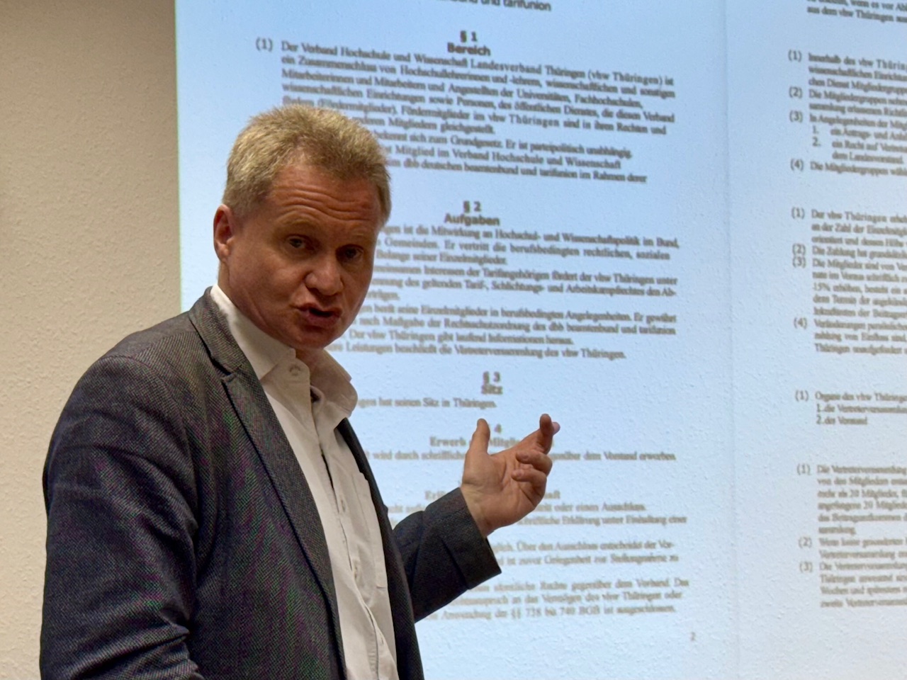 Am Nachmittag des 21. Novembers 2025 fand in der Geschäftsstelle des thüringer lehrerverbands (tlv) in Erfurt die formale Gründung des vhw Landesverbands Thüringen als Mitgliedsverband des Verbands Hochschule und Wissenschaft (vhw) statt. Die Gründungsveranstaltung wurde von dem Bundesvorsitzenden des vhw, Prof. Dr. Thorsten Köhler, im Beisein des 1. stellvertretenden Bundesvorsitzenden, Dr. Ulrich Weber, und des Landesvorsitzenden des vhw Niedersachsen, Prof. Dr. Bernd Weidenfeller, eröffnet. Bei der Eröffnung wurde der inklusive und gewerkschaftliche Charakter des vhw hervorgehoben. Als einziger Hochschulverband vertritt dieser die beruflichen Belange der Professorinnen und Professoren sowie der Mitarbeiterinnen und Mitarbeiter in Wissenschaft, Verwaltung und Technik an Universitäten, Fachhochschulen bzw. Hochschulen für angewandte Wissenschaften, Pädagogischen Hochschulen, Kunst- und Musikhochschulen sowie außeruniversitären wissenschaftlichen Einrichtungen. Thematisiert wurden auch die aktuelle Einkommensrunde der Gewerkschaften mit der Tarifgemeinschaft deutscher Länder, neue Initiativen aus der Bundespolitik in Bezug auf eine Aufzeichnung sämtlicher Arbeitszeiten der Lehrkräfte an Schulen und evtl. auch an Hochschulen sowie eine aus dem Jahr 2019 stammende Verfassungsbeschwerde gegen das Thüringer Hochschulgesetz von 2018, deren für die zukünftige gesamtdeutsche Hochschulgesetzgebung voraussichtlich wegweisende Entscheidung durch den 1. Senat des Bundesverfassungsgerichts weiterhin aussteht.